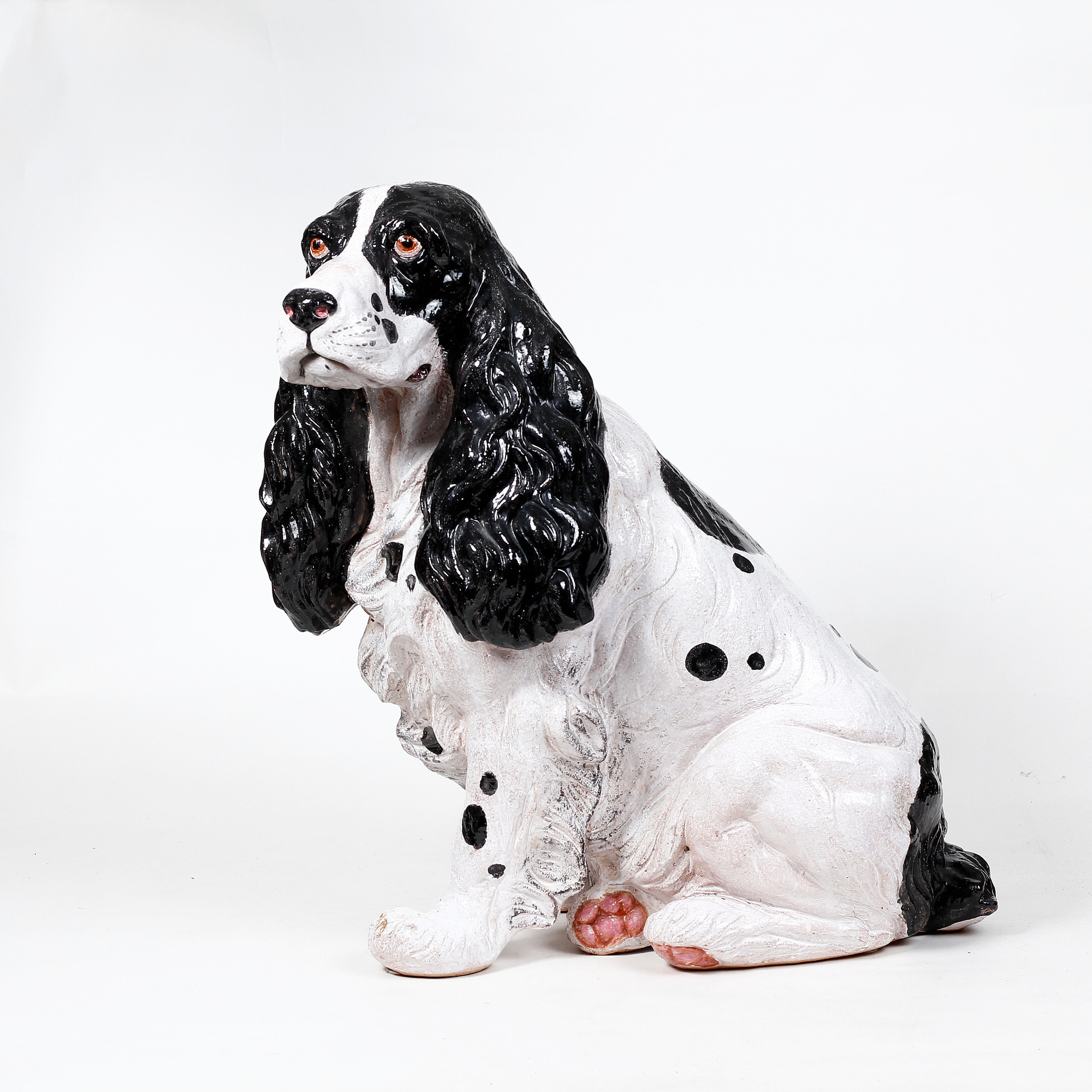 Dekorativ Cocker Spaniel hundfigur i terrakotta, Italien, 1950-tal Höjd ca 59 cm. Mycket gott skick, dock glasyrmista på höger öra 2 900kr