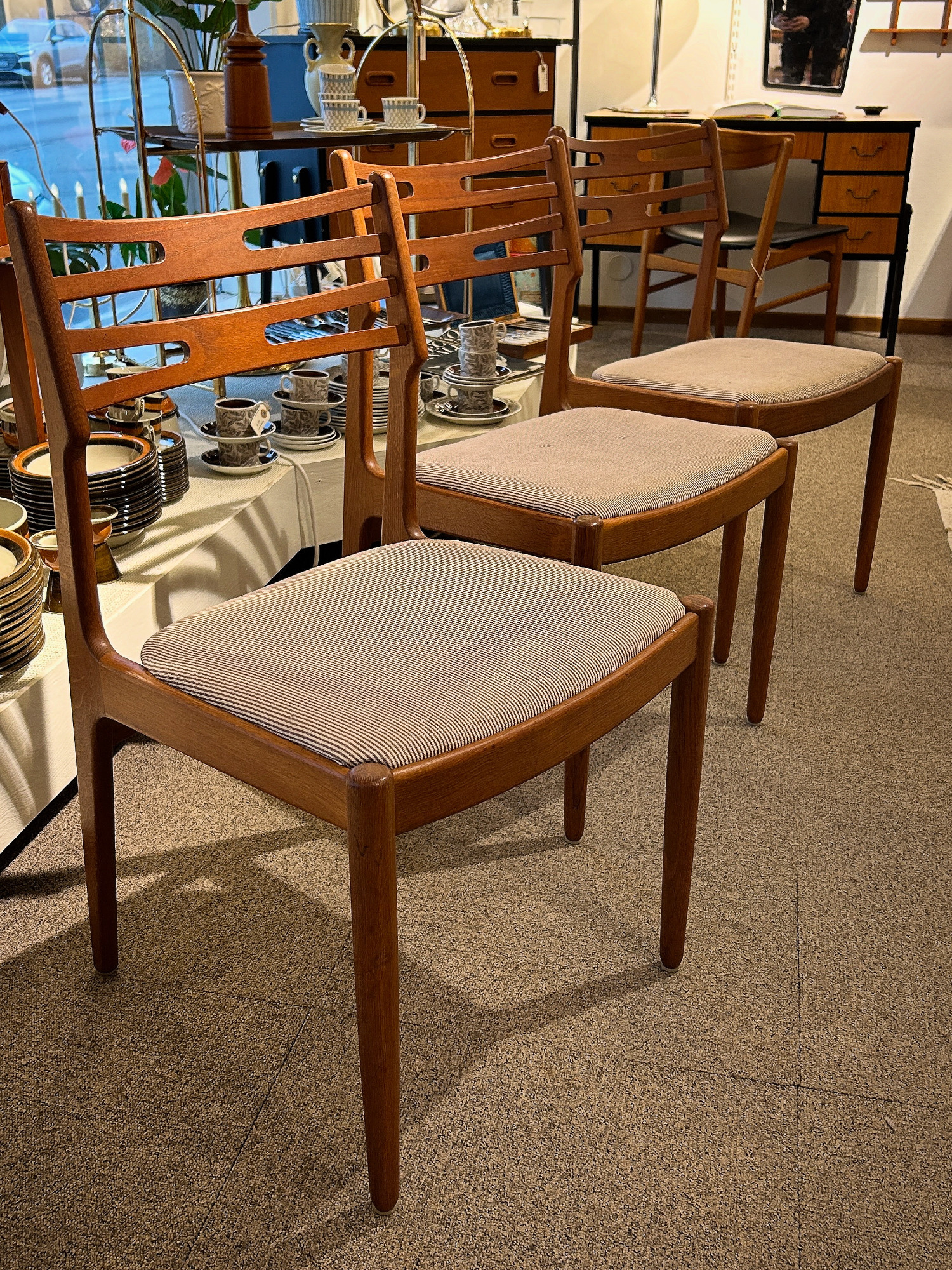 Formgiven 1960. Stomme i teak, omklädd med ny stoppning & tidstrogen klädsel i ulltyg av professionell möbeltapetserare. Pris 6 500kr